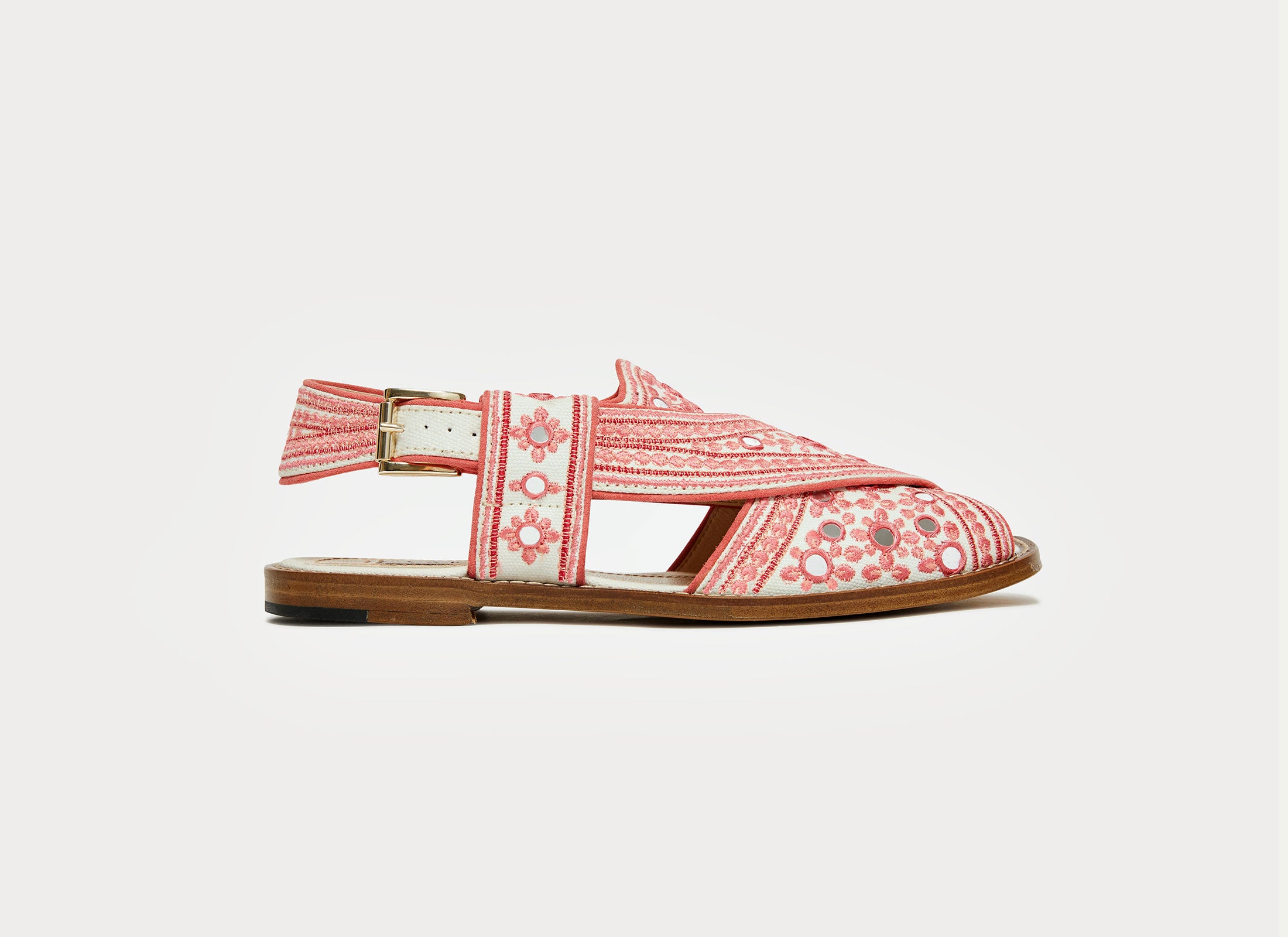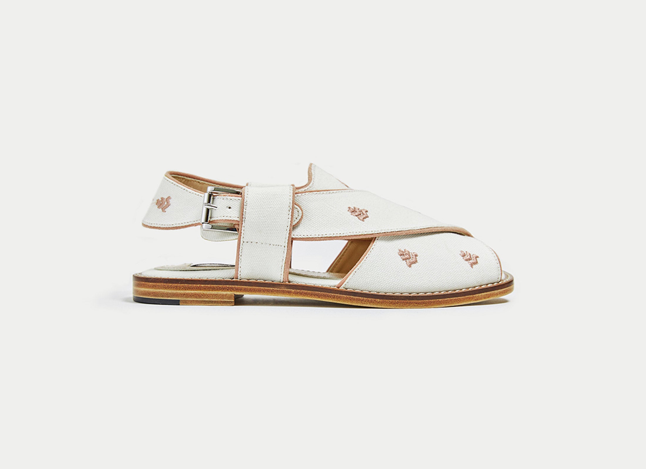 Tempering the intricacy of the embroidery is the shoe’s contemporary overtones, communicated through the pared down colour palettes and an understated mood. Canvas cotton straps sit against the sumptuous leather lining and soles, offering a softer update, while the subtly squared open toe provides another feminine twist. Choose from black and gold, white and pink or white and navy.